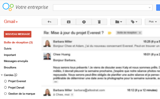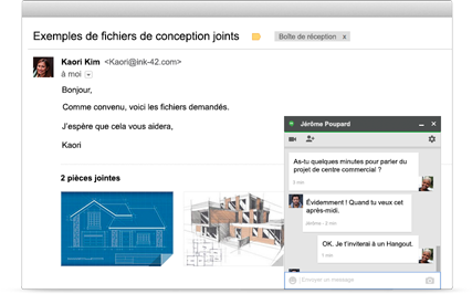 Démarrez un chat avec un collègue, composez le numéro de téléphone d'un client et accédez ou rejoignez une réunion en vidéo directement depuis votre boîte de réception avec Hangouts